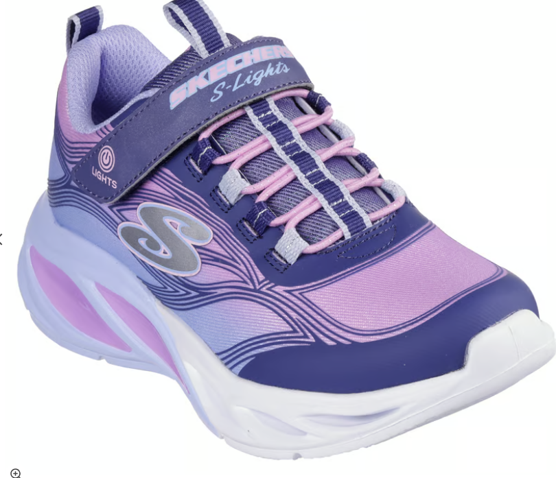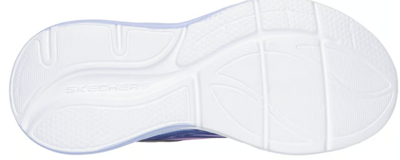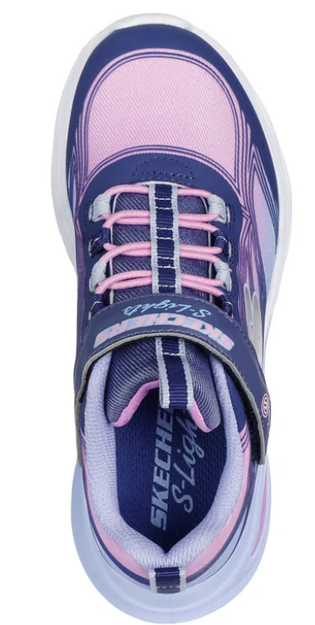 Light up the playground wearing Skechers S-Lights®: Cosmic Glow. This light-up active design features an ombre sparkle mesh and synthetic upper with stretch laces, an adjustable instep strap, and a well-cushioned midsole with step-activated lights.