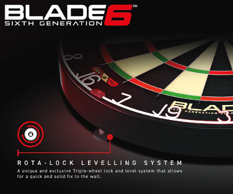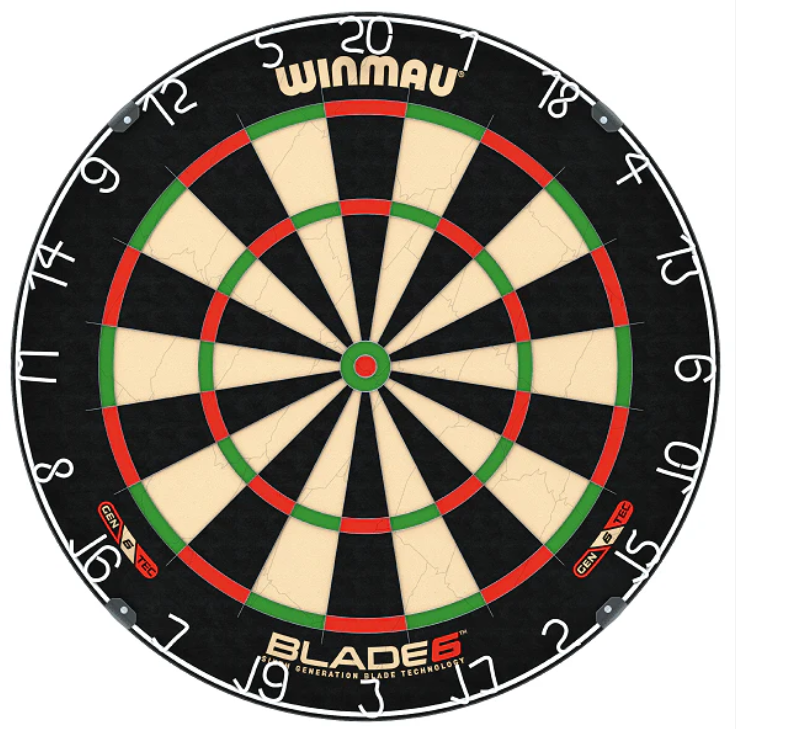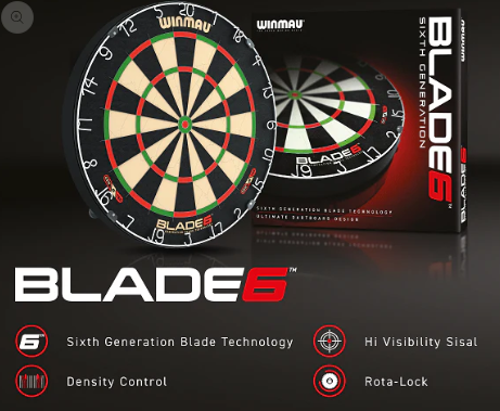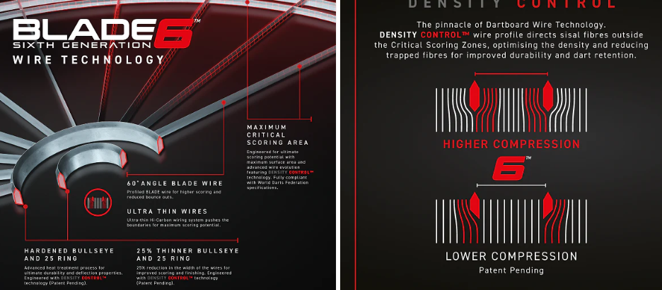 The Blade 6 dartboard delivers outstanding playability, durability and performance. The uniform density on the outer core and the high visibility playing surface increases scoring potential and provides perfect vision Blade’s pioneering web design features the latest ‘Density Control™’ for optimum fibre density and improved dart retention in the double, treble and bullseye zones, for maximum scoring power, Patent Pending.